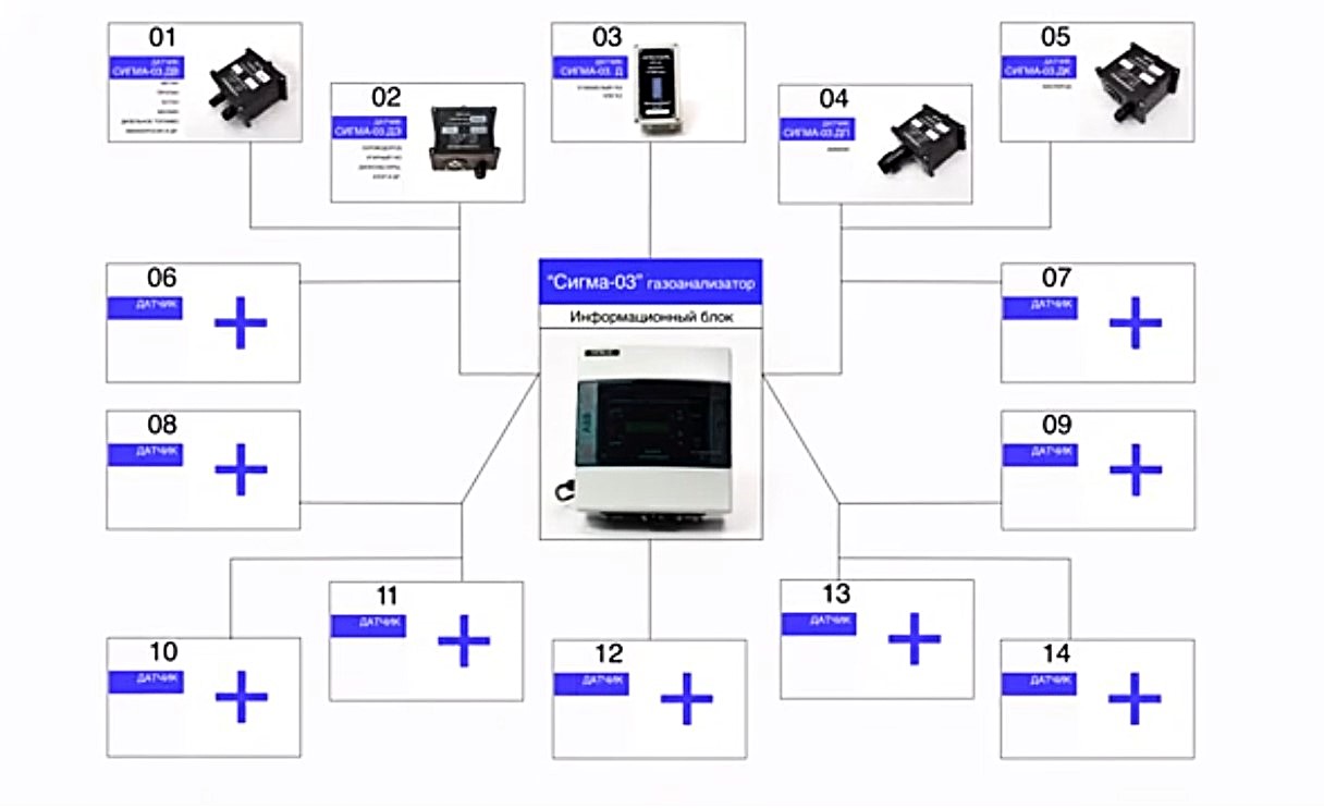 Стационарный газоанализатор СИГМА-03 является модульной системой, состоящей из информационного блока и выносных датчиков, предназначенных для автоматического, непрерывного контроля воздуха и выявления опасных концентраций кислорода, горючих и токсичных газов, паров и их смесей на промышленном объекте. Различные модификации прибора позволяют контролировать одновременно от 1 до 14 веществ на одном блоке или собрать систему блоков и датчиков под общим управлением, с контролем единой унифицированной системы на предприятии.